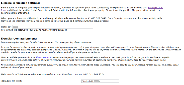 Expedia hotel ID so Planyo can access your property. Once this is done, the extension will download the list of your hotel rooms.