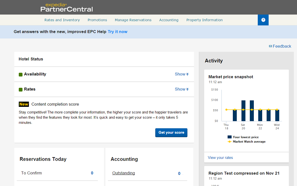 Expedia Partner Central (EPC) is the place that includes direct access for you to manage rates, financial details and processes, detailed information about your property as well as a number of other tools.