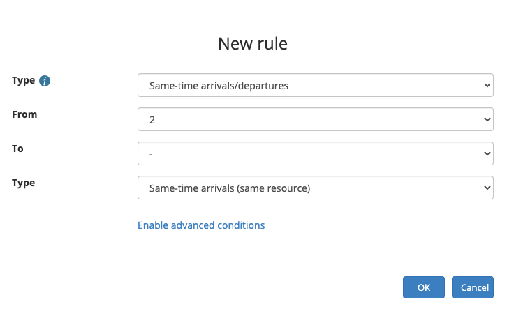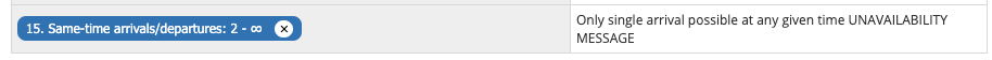In the rule settings you can specify the type (arrival or departure and if this rule should be applied to the same resource or all your resources) as well as the number of simultaneous arrivals in order for the rule to be triggered. For example, if you want to limit the number of simultaneous check-ins (arrivals) in given time unit (the time unit depends on your resource, it can be 15min/30min/1h) to a single person, then set the option From to 2 and To to - (without a limit). This will trigger the rule starting from 2 persons. Now, instead of setting a price for your resources, choose UNAVAILABILITY MESSAGE which will show an error message to the customer and make it impossible for your customers to enter a reservation if the limit is exceeded.