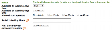 Here, for hour based resources, you specify your standard opening and closing time during the workdays as well as determine when during the day the rentals can start (including specific times such as 10am, 2:30pm, 5pm). You can also determine how much time is needed between any two consecutive rentals.