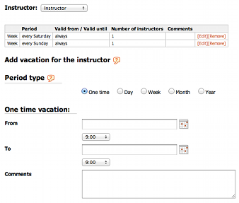 Here you can define either one-time vacations which are useful when you have an off-season period or a period when your resource goes through maintenance or is not available for any other reason. The recurring vacations (e.g. weekly vacations) are useful to determine the days when you don’t work or parts of specific days when you don’t work (e.g. monday mornings).