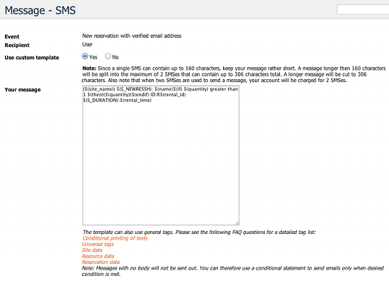 Planyo can also send SMS messages to the customers or administrators, the same way as with email messages. In order to be able to use SMS messages, you need to purchase SMS packs in the
