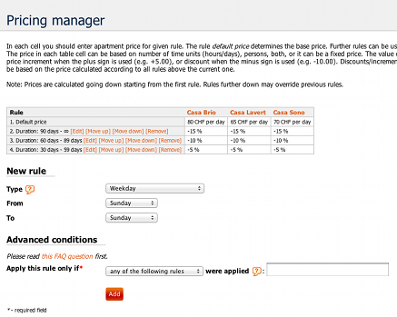 The pricing manager works as a list of rules (displayed as rows of a table), which are simple conditions which, when met, apply the given price. When determining the price, planyo starts with the first row (default price) and goes down the list. The rules whose condition is not met are simply ignored when calculating the final price. The other ones are applied in one of the following ways: