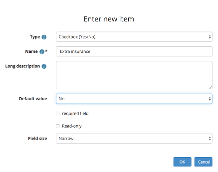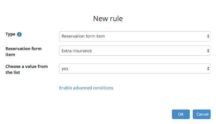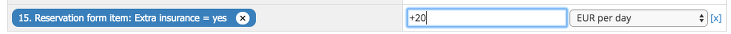 Now set the price which should be added when the checkbox is selected, e.g. here we'll add 20 EUR to each day of the rental when the customer chooses extra insurance (note that you could just add 20 EUR or e.g. 20 EUR per day and per person etc.):