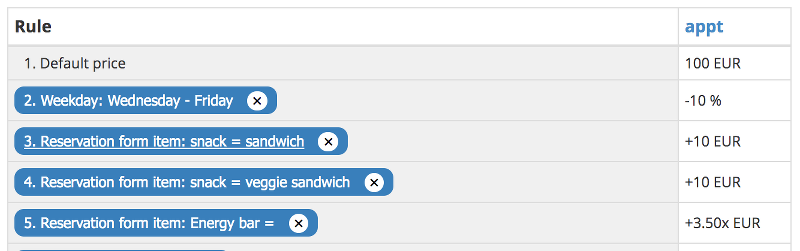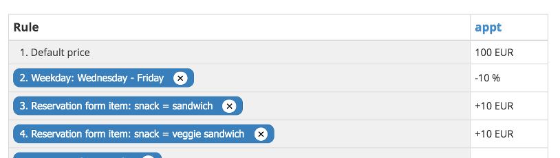 Now that you have both rules added, set the price for each value. Here we'll simply add EUR 10 to the price for both sandwich choices. We could of course set something like '10 EUR per person' or '10 EUR per person and day' etc. depending on how the extra item is to be understood.