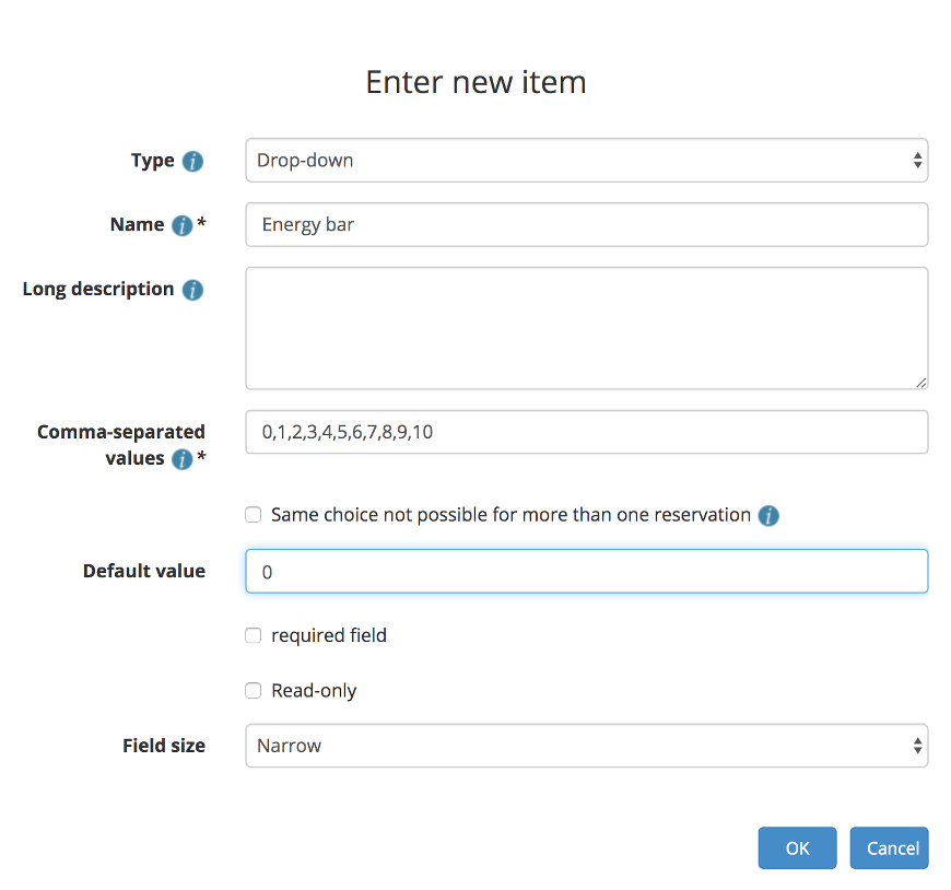 Let's take another simple example: a form item whose quantity can be chosen by customer. Let's add another dropdown called: energy bar where the customer can choose any quantity from 0 to 10.