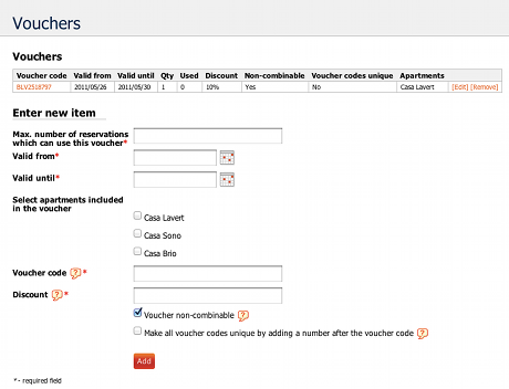 Site settings / Vouchers. Vouchers can have an expiry date and maximum number of reservations for which they can be used. You can also specify the resources for which the vouchers can be used. The voucher discount can be expressed as a fixed amount (e.g. $50) or as a percentage (e.g. 20% off). If you want to keep track of the vouchers, you can also have a number appended to the voucher code, e.g. for voucher code ABC the valid vouchers would be ABC01, ABC02, ABC03 etc. The zeros which come before the numbers are optional, so ABC1 is considered the same voucher code as ABC01 or ABC001.
