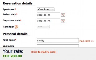 This lets you enter any price you wish. You can do this even for reservations which normally cannot be entered due to an unavailability message rule in pricing manager. This price does NOT include the additional products which you will still choose on the second reservation page (if there are any). However, the products which are set up to be added automatically to all reservations (such as obligatory final cleaning etc.) WILL BE included because they are already included in the rate presented to the customer.
