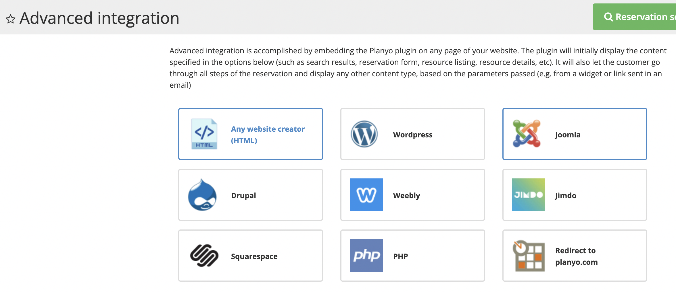 Planyo Plugin / Advanced integration section. We won't be using the search widget because that widget is meant to display the results elsewhere while for the tutorial we want a compact widget showing the results and then the booking form all in the same place on a single page.