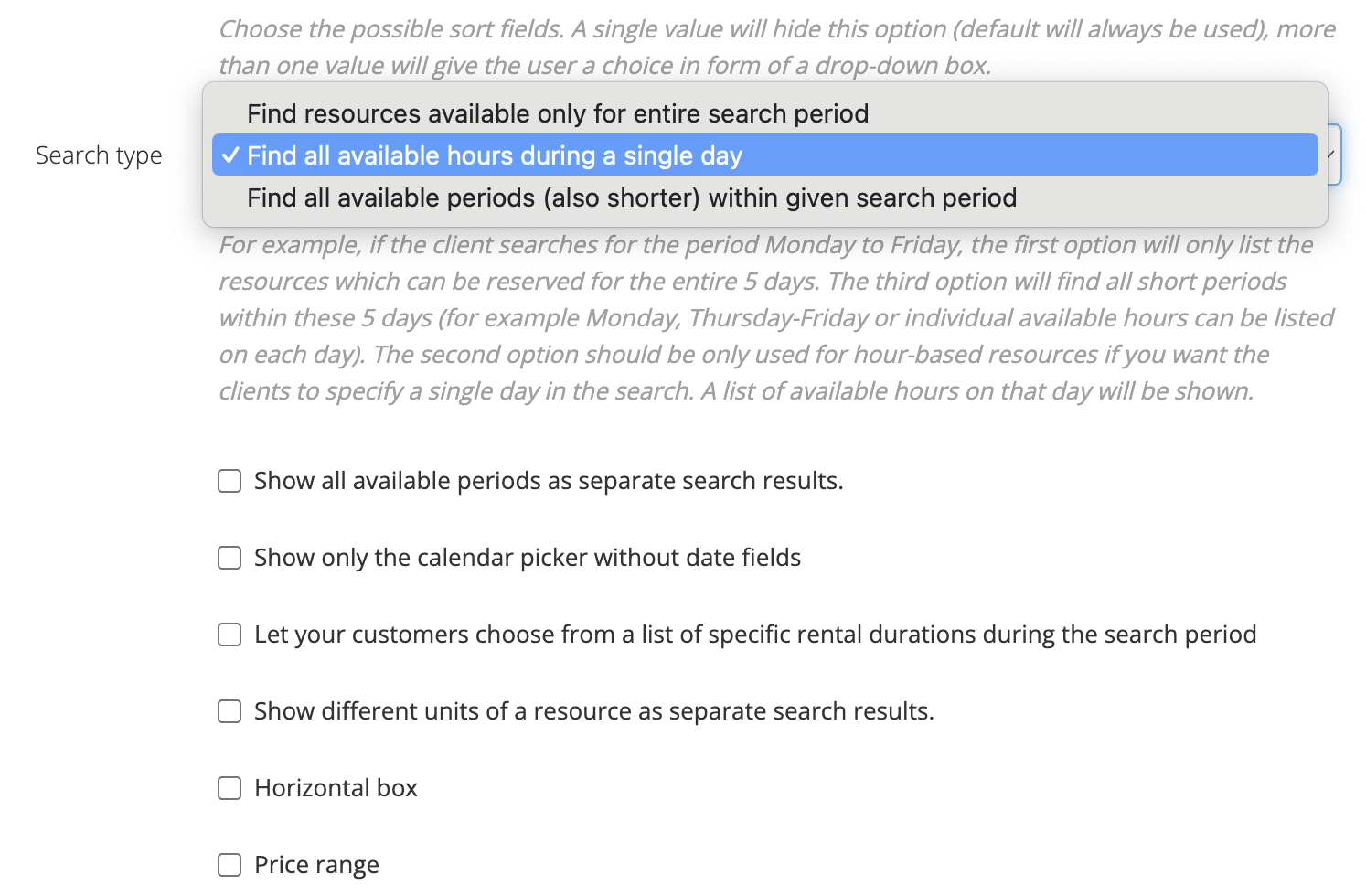 For hour-based resources we'll most likely want to choose the search type where the customer chooses a single date and they get all available 30min/1h slots for the day for all resources with availability. It would be also possible to have the customer select two dates where the system searches for all available slots within the selected date range. The first choice will create a more compact widget. In this tutorial we'll want to give the customer the choice between 30min and 1h appointments/rentals. You could skip this and always preselect a duration for an even more compact widget.