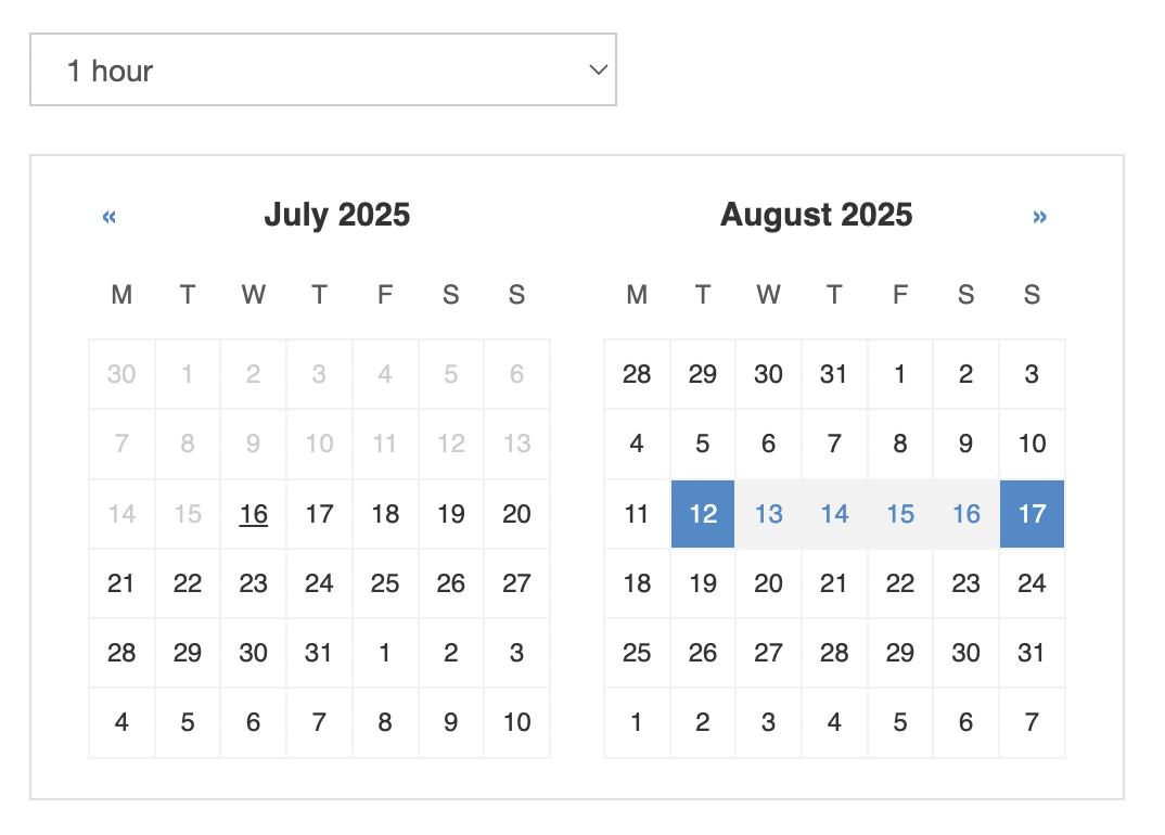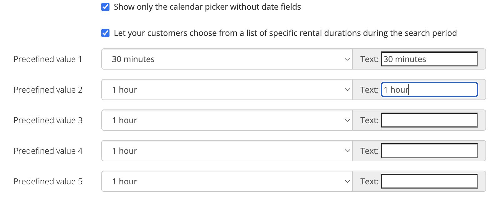 Let your customers choose from a list of specific rental durations during the search period and add 2 predefined values: 30 minutes and 1 hour. Place both labels in the