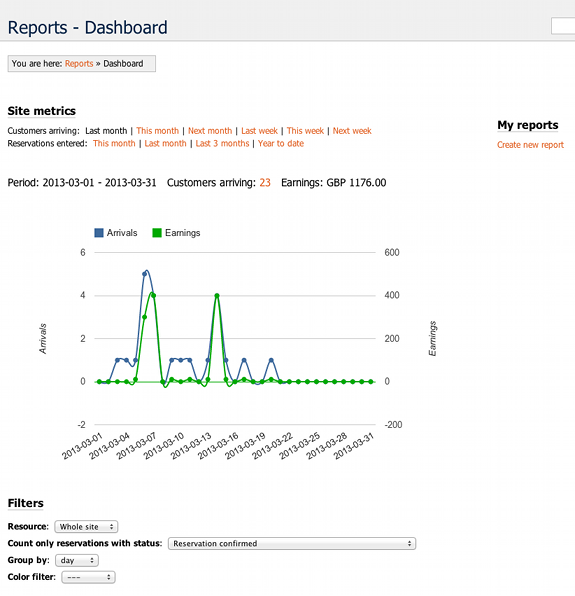 Here you'll see a dashboard with an overview of your reservations where you see daily activity (customers arriving or reservations entered) for periods such as last/next/this month/week etc with the totals (number of reservations and earnings) and a possibility to see the exact list of reservations for the displayed period (click on the number in the header). Underneath the graph you can apply a number of filters to see stats for a subset of your reservations (e.g. for specific resource or marked with specific color).