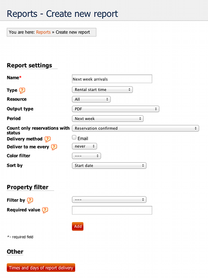 In this sample, we'll create a report of persons arriving next week. Later we'll configure this report to be sent by email every Friday afternoon. For arrivals, report type should be set to Rental start time, for departures, choose Rental end time, and for a report of reservations entered into the system during a period, choose Reservation creation date (for other report types, see the next part of this tutorial). We'll leave the other options at defaults, except we want the default output type as PDF. You could set a number of filters here, as well: